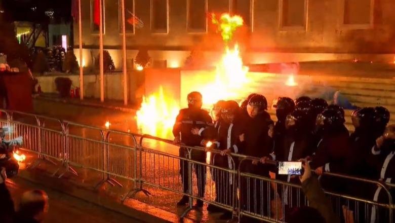 Për të inkurajuar militantët e tij që të vazhdojnë vandalizimin e Kryeministrisë, Sali Berisha qëndroi në podium duke valëvitur flamurin kombëtar ndërkohë që drejt godinës qeveritare hidhedhin në breshëri molotovë dhe fishekzjarrë.