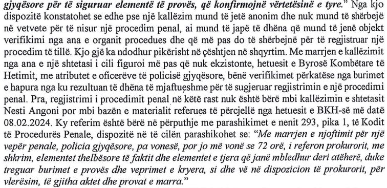 Por këtyre pretendimeve për të zhbërë denoncimin e qytetarit më të lakuar anonim të drejtësisë shqiptare i është përgjigjur gjykatësi Engert Pëllumbi në vendimin që Lapsi.al e ka lexuar. Sipas arsyetimit të tij pretendimi se ligji nuk e parashikon mbështetjen tek kallëzuesit anonimë është një lexim i pjesshëm dhe manipulativ i tij. Pasi vërtet ligji e thotë këtë, por në një nen tjetër parashikohet se “Të dhënat e kallëzimit anonim mund të verifikohen nga prokurori për të siguruar elementë të provës që konfirmojnë vërtetësinë e saj”. Pra ajo që thotë gjykata është se SPAK, pasi ka marrë këtë kallëzim ka hetuar më tej dhe ka vërtetuar se dyshimet e ngritura nga Nesti Angoni kishin bazë (shiko faksimilen poshtë nga vendimi i gjykatës).