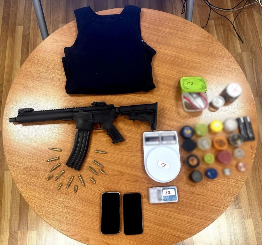 Gjatë kontrolleve në banesën ku jetonin Kostandin Nesturi, 32 vjeç nga Saranda dhe greku Aleksandros Banin, 29 vjeç, u gjetën dhe sekuestruan 1 armë zjarri automatike me 9 fishekë, 1 jelek anti-plumb, 5 fishekë, çift targash false, kartë identiteti greke false, 2 vula zyrtare, 4 vula biznesi, 3.6 gram kokainë, 27 gram marijuanë, 2 peshore, 16 grirës marijuane, 2 Lap-Top.