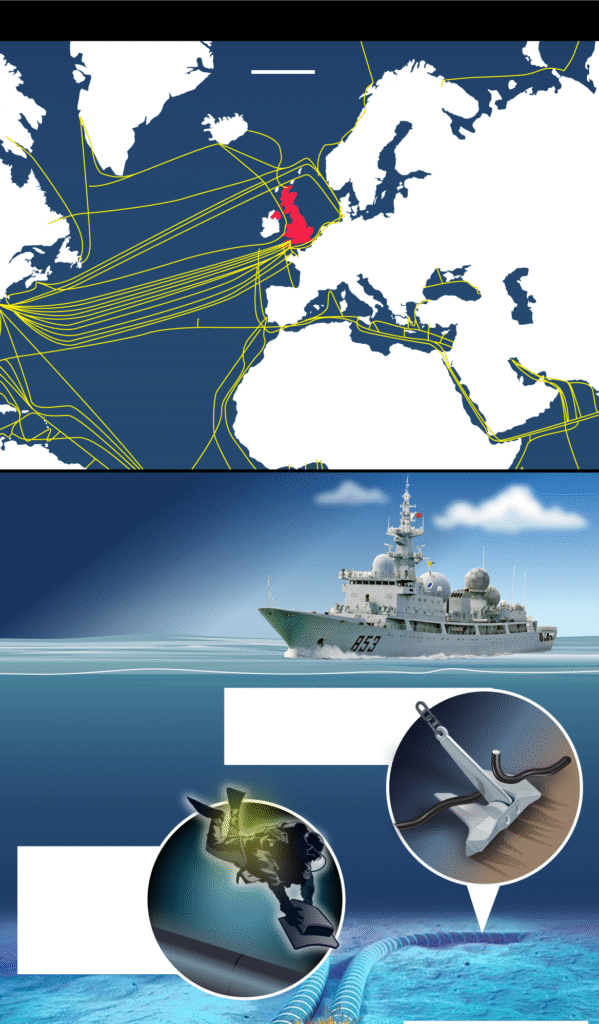 Një rrjet i ndërlikuar kabllosh nënujore që kalon nëpër brigjet britanike – kritik për komunikimin, tregtinë dhe sigurinë kombëtare – po rrezikohet nga sabotazhet e mundshme nga Kina dhe Rusia. Sipas një raporti të ri, Mbretëria e Bashkuar është “jashtëzakonisht e papërgatitur” për t’u përballur me kërcënime të koordinuara ndaj infrastrukturës së saj detare.