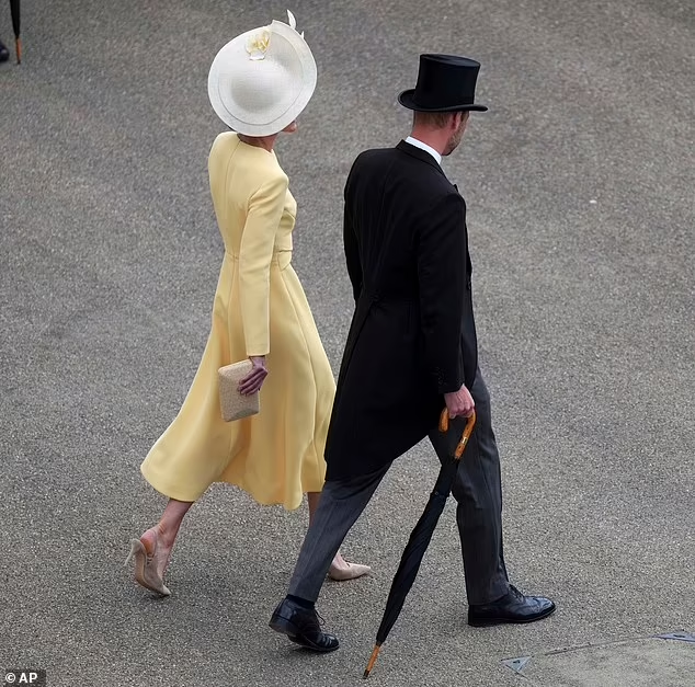 Kate, 43 vjeçe, u shfaq me të njëjtin fustan ngjyrë limoni nga Emilia Wickstead dhe kapele nga Phillip Treacy që kishte veshur edhe në vitin 2022 për Jubileun e Platinit të Mbretëreshës Elizabeth. Ajo qëndroi në tarracë për të dëgjuar himnin kombëtar në kopshtin e Pallatit Buckingham, ndërsa Princi William kishte veshur një kostum të kompletuar gri dhe një kapele të lartë tradicionale.