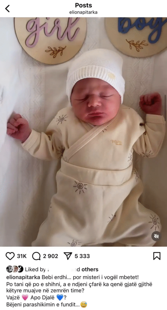 Pasi mbajti të fshehtë gjininë gjatë gjithë shtatzënisë (një zgjedhje personale dhe e respektueshme) Eliona publikoi menjëherë pas lindjes një quiz në Instagram ku ndjekësit ftoheshin të gjenin: është vajzë apo djalë?