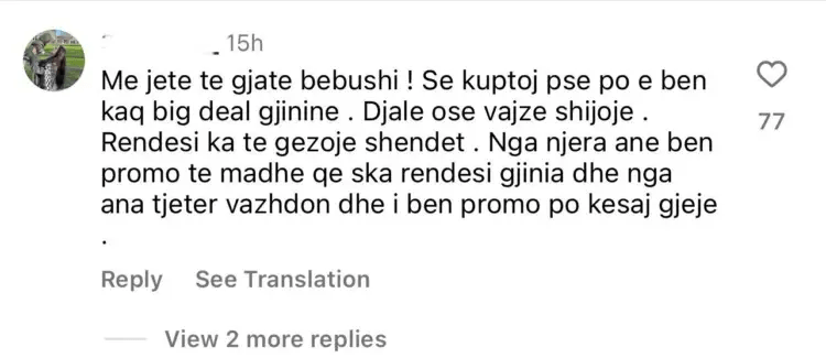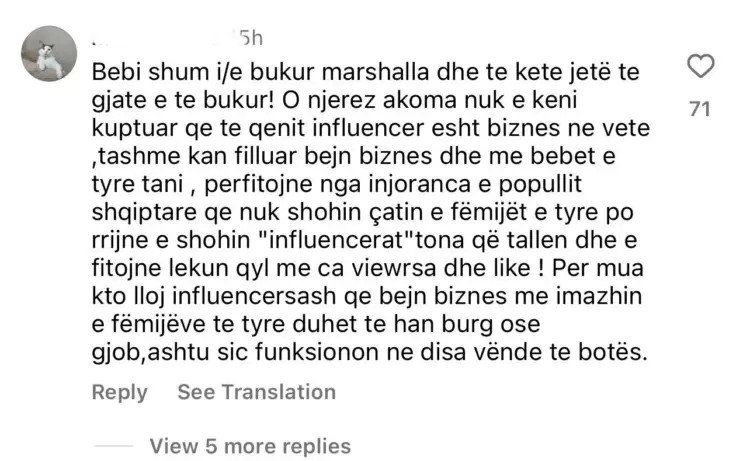 Pjesa më e madhe e komenteve nën postimin e Elionës nuk ishin as urime, as kritika personale, por reflektime të shoqërisë ndaj një fenomeni që po përhapet gjithnjë e më shumë: kthimi i bebeve në pjesë të pandashme të “content-it” ditor.