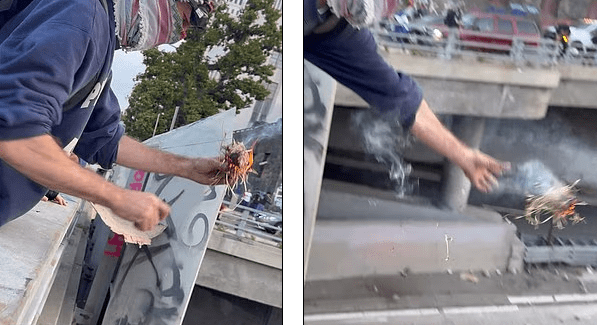 Në një sulm të dhunshëm, policët u strehuan nën një mbikalim të autostradës 101 ndërsa goditeshin nga mbi ura me mjete ndezëse, skuterë elektrikë dhe objekte të tjera. Protestuesit hodhën lëndë djegëse mbi makina policie për të shkaktuar zjarr.