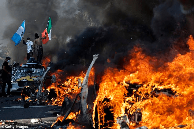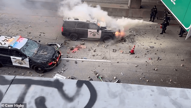 Të maskuar me balaklava dhe me flamuj meksikanë, protestues u filmuan mbi makina të Waymo-s (taksi pa shofer), teksa zjarre të mëdha shpërthyen nga makinat e djegura.