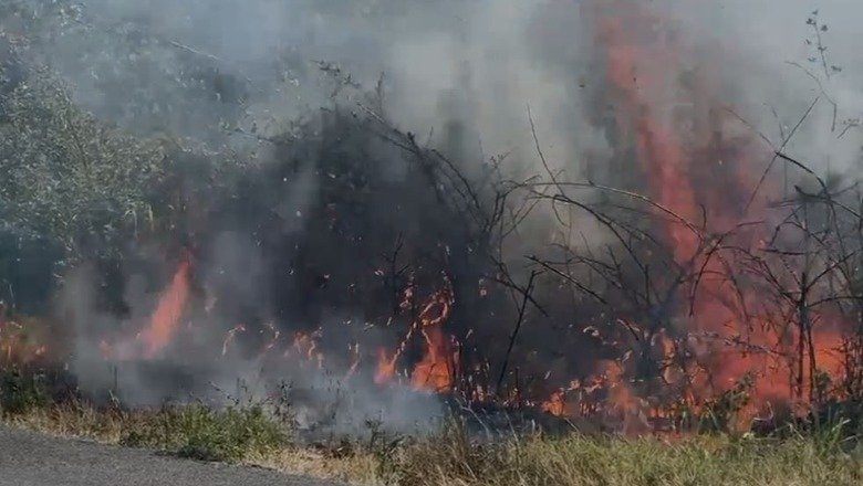 Lezhë/ Zjarr në zonën e Shënkollit, digjet një sipërfaqe me bimësi, rrezikohen banesat