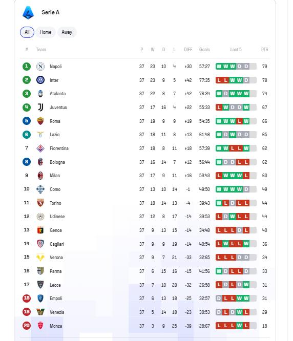 Napoli i Antonio Contes vjen në këtë javë të fundit me 79 pikë, vetëm një më shumë se Interi i Simone Inzaghit. Një fitore e garanton titullin për napolitanët, pavarësisht rezultatit të Interit. Por çdo hap fals mund të jetë fatal.