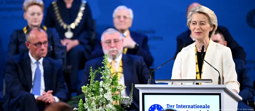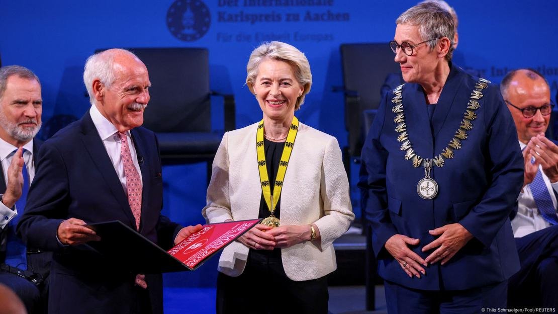 Në një ceremoni të mbajtur në sallën historike të kurorëzimeve në Aachen, Presidentja e Komisionit Evropian, Ursula von der Leyen, u nderua me Çmimin Ndërkombëtar të Karlit të Madh – një nga vlerësimet më prestigjioze për kontributin në bashkimin evropian. Në fjalimin e saj, Von der Leyen bëri thirrje për një fazë të re në historinë e kontinentit: ndërtimin e një “Evrope të pavarur”.