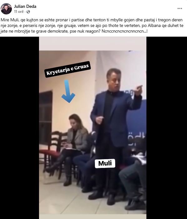 “Mirë Muli, që kujton se është pronar i partisë dhe tenton t’i mbyllë gojën dhe pastaj i tregon derën një zonje, e përsëris një zonje, një gruaje, vetëm se ajo po thotë të vërtetën, po Albana që duhet të jetë në mbrojtje të grave demokrate, pse nuk reagon? Ncnccncncncncnncncn…”, shkruan Julian Deda.