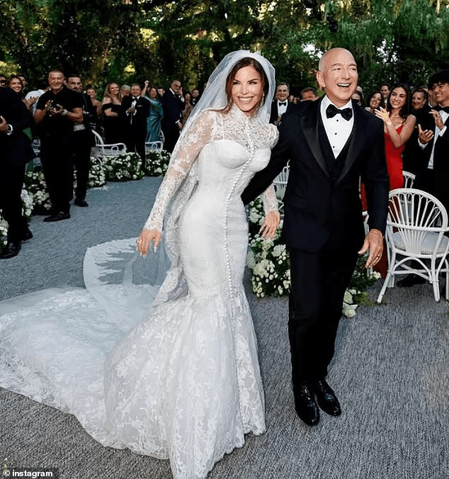 Nusja e buzëqeshur, 55 vjeç, u martua me themeluesin e Amazon-it, 61 vjeç, në Venecia të Italisë të premten, duke veshur një fustan me dantellë të markës Dolce & Gabbana.
