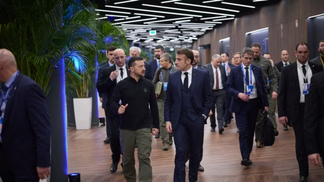 Presidenti ukrainas, Volodymyr Zelensky, majtas, me ideatorin e KPE-së, presidentin francez, Emmanuel Macron, në samitin e Budapestit.